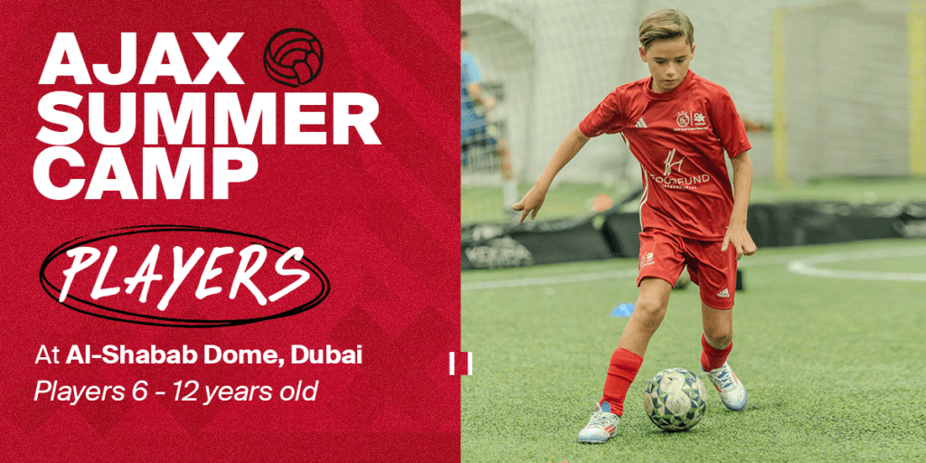 Are you between 6 and 12 years old and dream of training like a real Ajax player? Don’t miss your chance to join the Ajax UAE Camps by FFI from Monday, June 30 to Friday, August 8, 2025, at Al Shabab Dome, Dubai